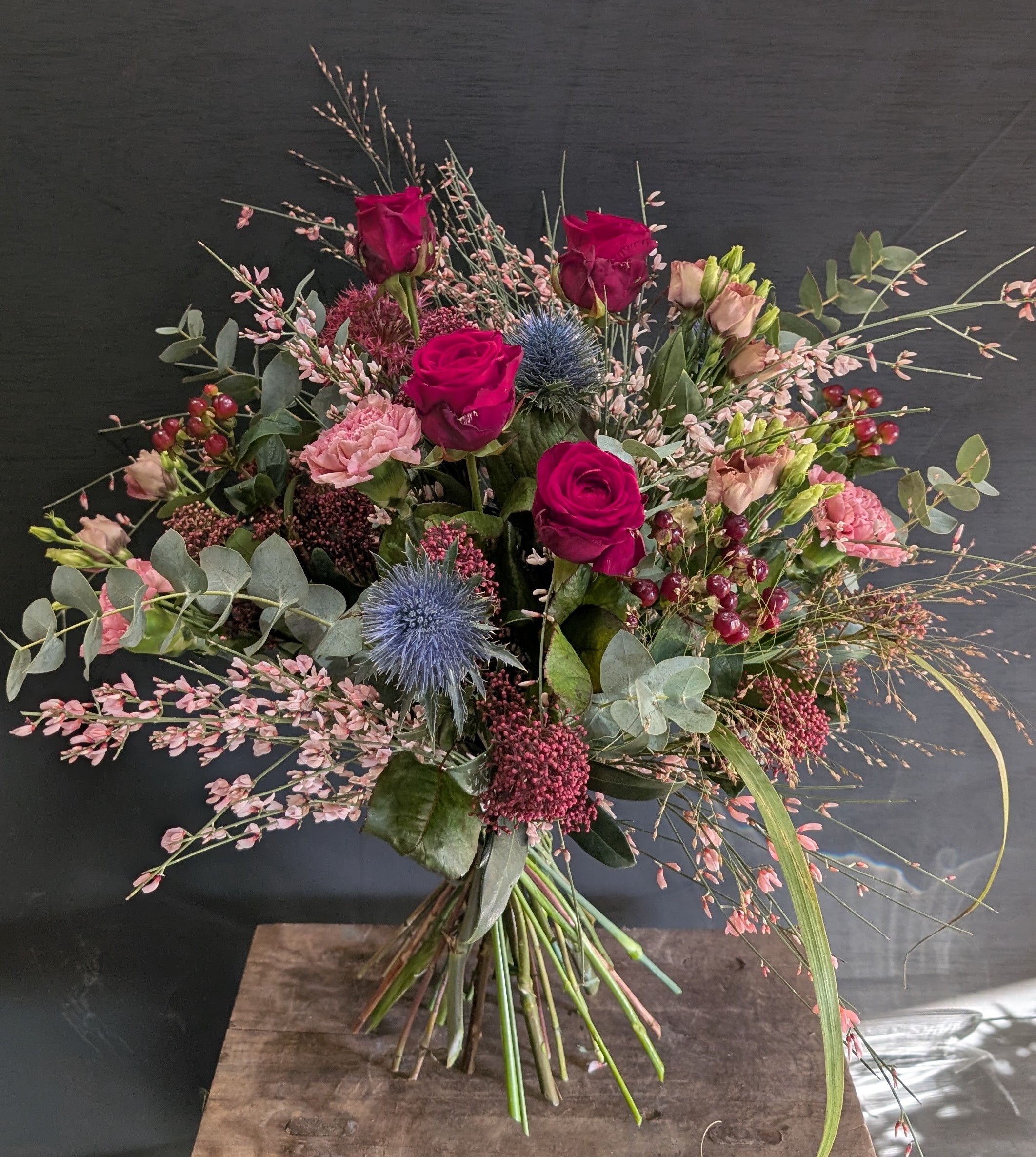 A carefully curated mix of roses, seasonal blooms, berries, and foliage creates a visually striking and elegant look.